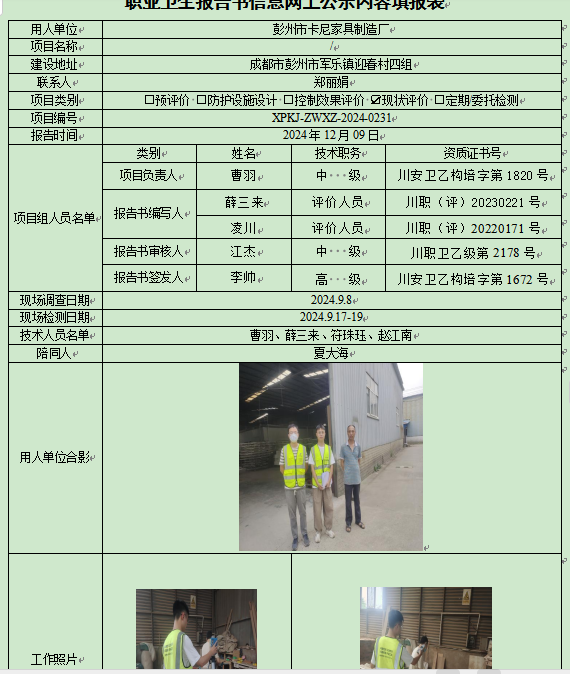 彭州市卡尼家具制造厂职业病危害因素现状评价