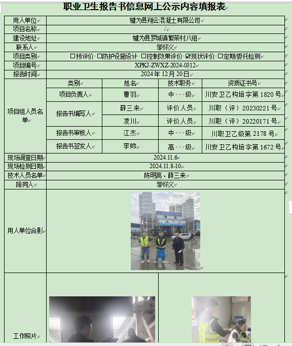犍为县翔云混凝土有限公司职业病危害因素现状评价