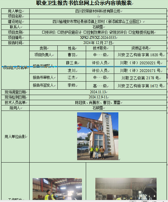 四川双荣新材料科技有限公司职业病危害因素现状评价
