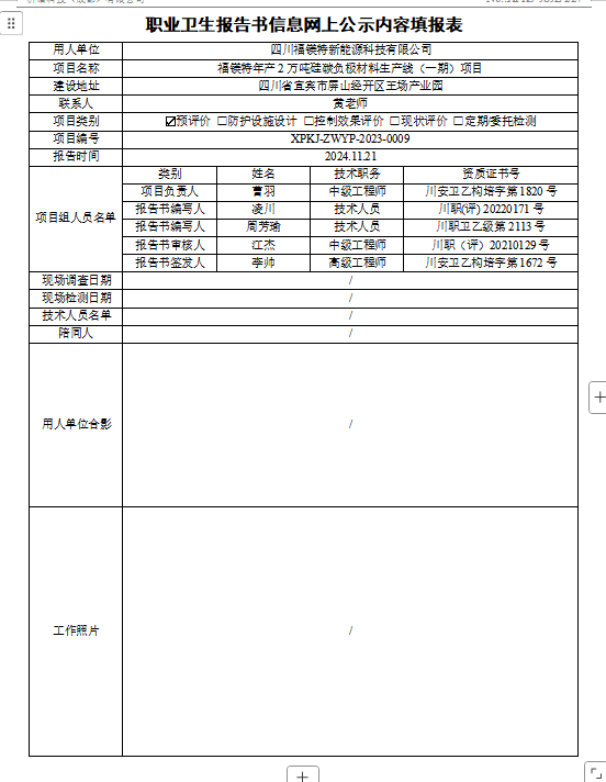 四川福镁特新能源科技有限公司职业病危害因素预评价