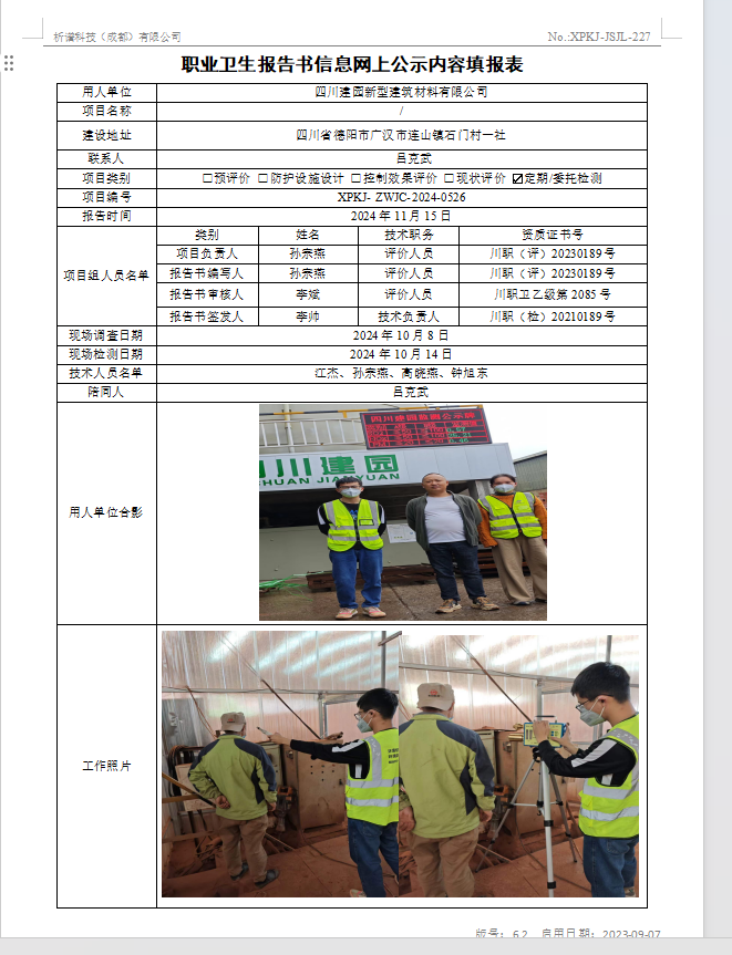 四川建园新型建筑材料有限公司职业病危害因素定期检测