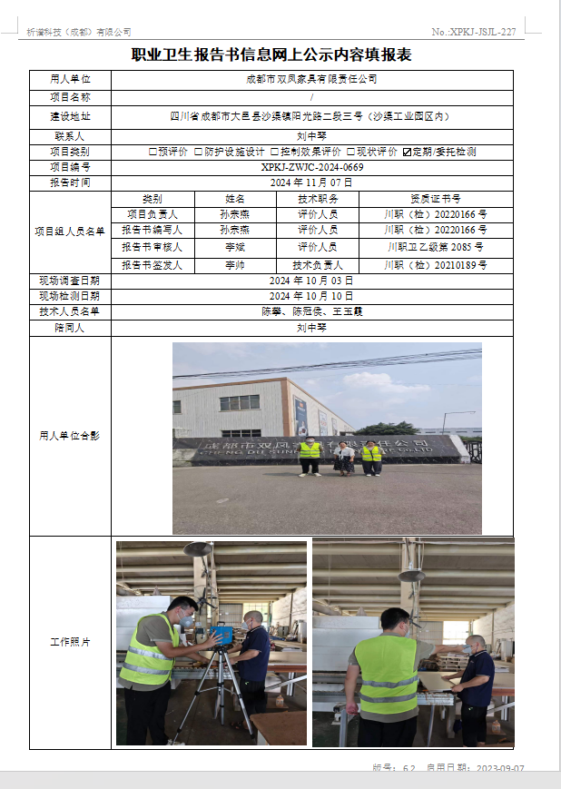 成都市双凤家具有限责任公司职业病危害因素定期检测