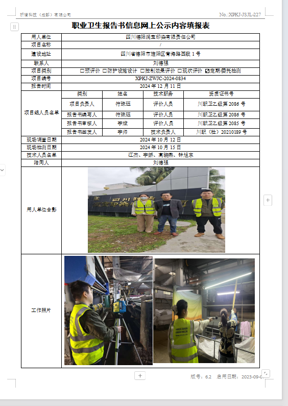 四川德阳润宝印染有限责任公司职业病危害因素定期检测