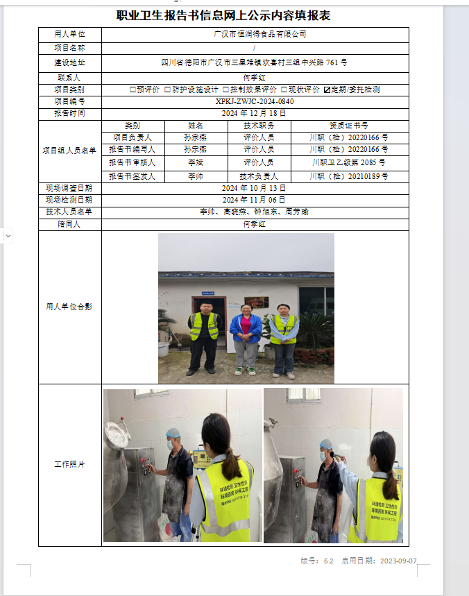 广汉市恒润得食品有限公司职业病危害因素定期检测