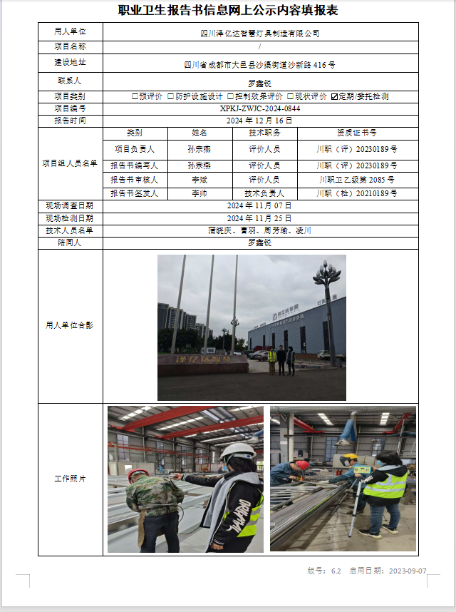 四川泽亿达智慧灯具制造有限公司职业病危害因素定期检测