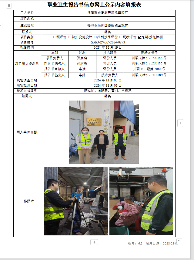 德阳市永高家居用品塑胶厂职业病危害因素定期检测