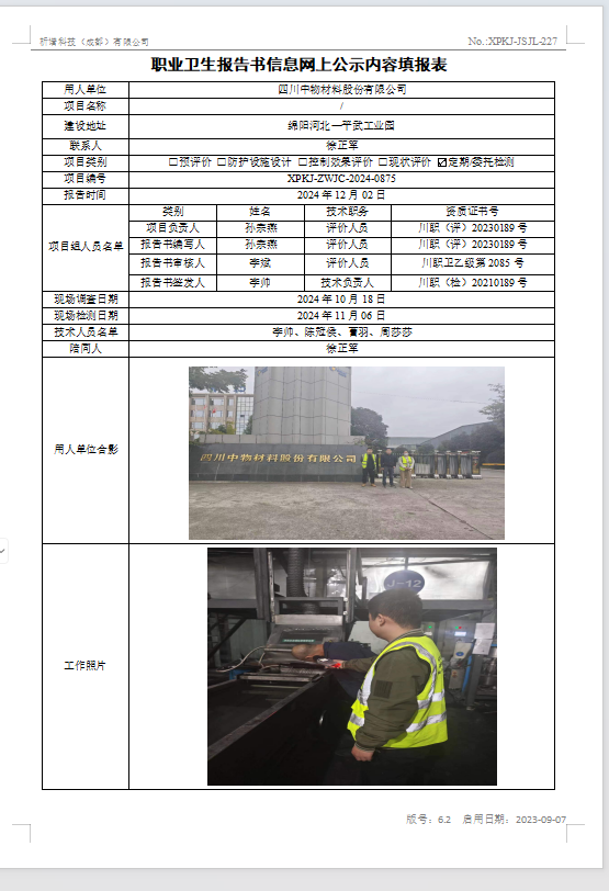 宜宾市天宜锂业科创有限公司职业病危害因素定期检测