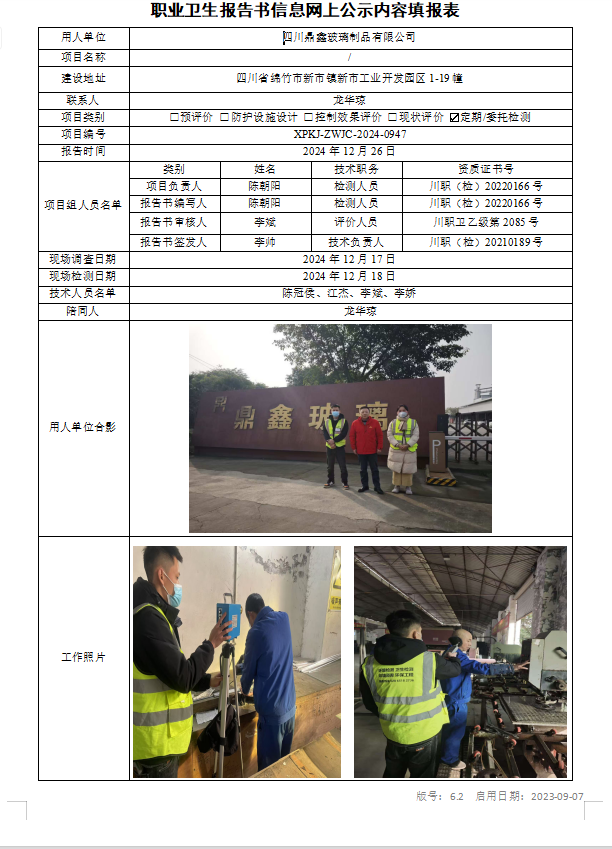 四川鼎鑫玻璃制品有限公司职业病危害定期检测