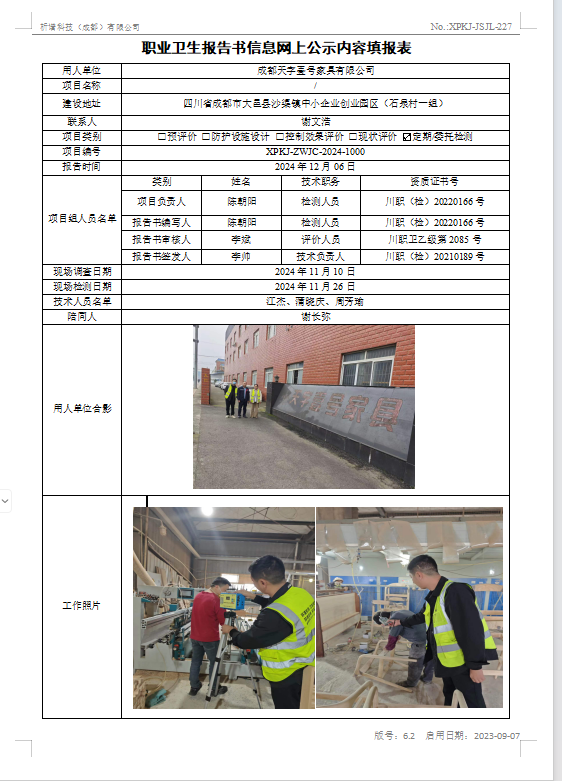 成都天字壹号家具有限公司职业病危害因素定期检测
