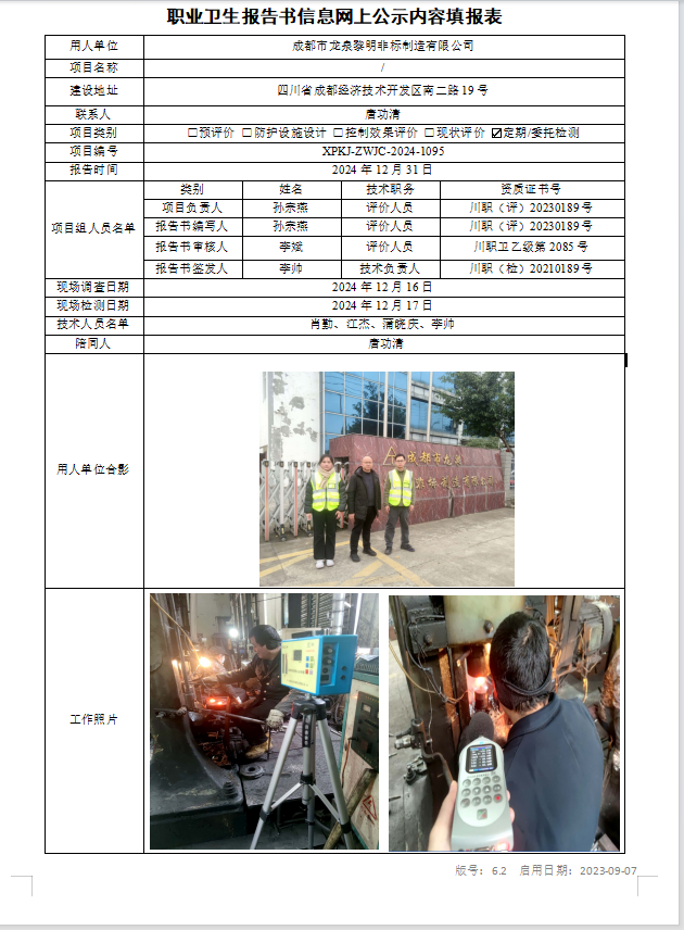 成都市龙泉黎明非标制造有限公司职业病危害定期检测