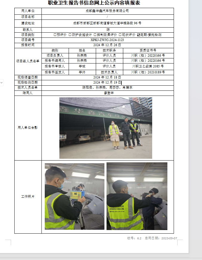 成都鑫华鑫汽车服务有限公司职业病危害因素定期检测