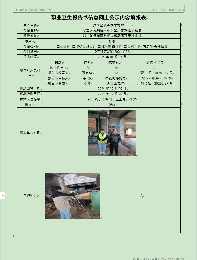 罗江区泓森柏木材加工厂职业病危害因素定期检测