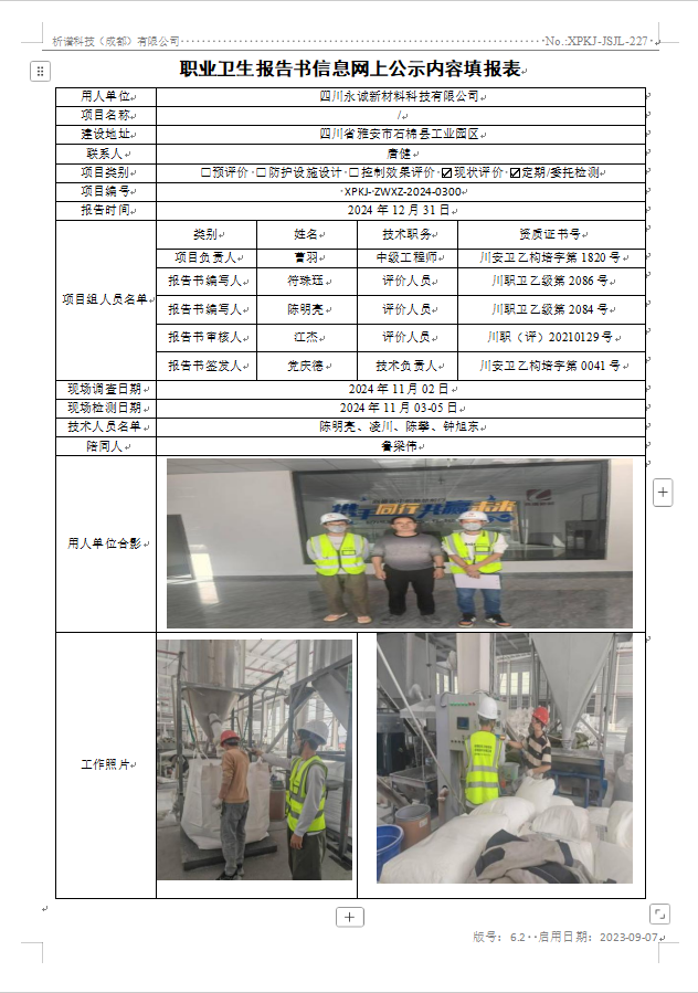 四川永诚新材料科技有限公司职业病危害因素现状评价
