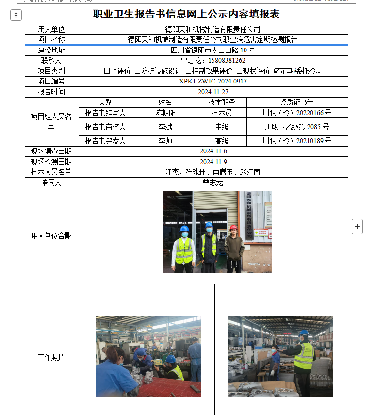 德阳天和机械制造有限责任公司职业病危害因素定期检测