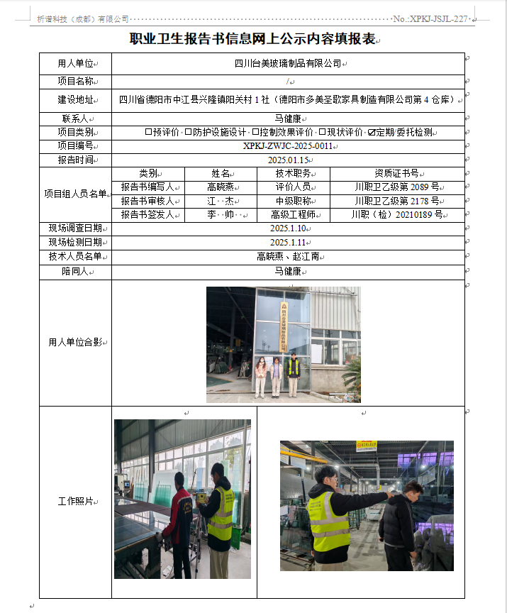 四川台美玻璃制品有限公司职业病危害因素定期检测