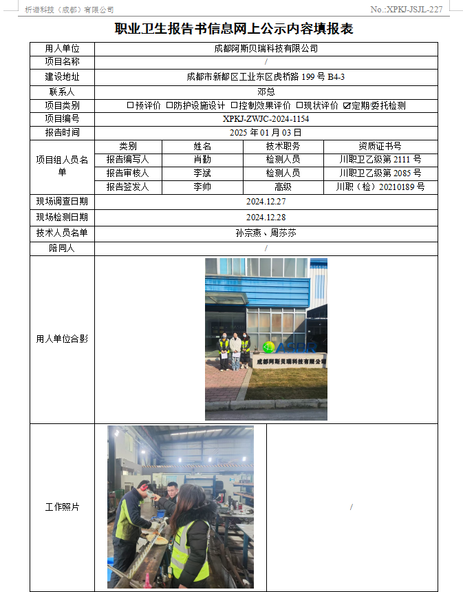 成都阿斯贝瑞科技有限公司职业病危害因素定期检测