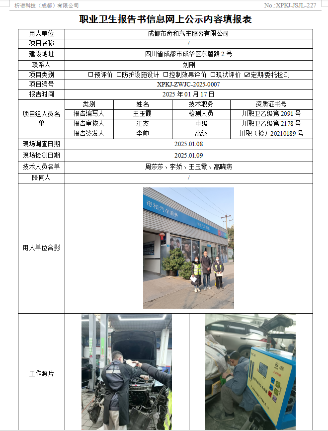 成都市奇和汽车服务有限公司职业病危害因素定期检测
