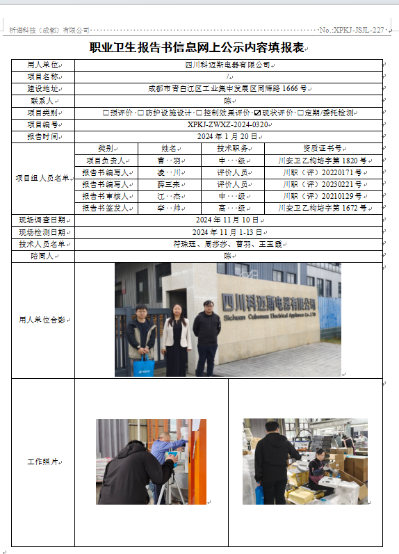 成都科迈斯电器有限公司职业病危害因素现状评价