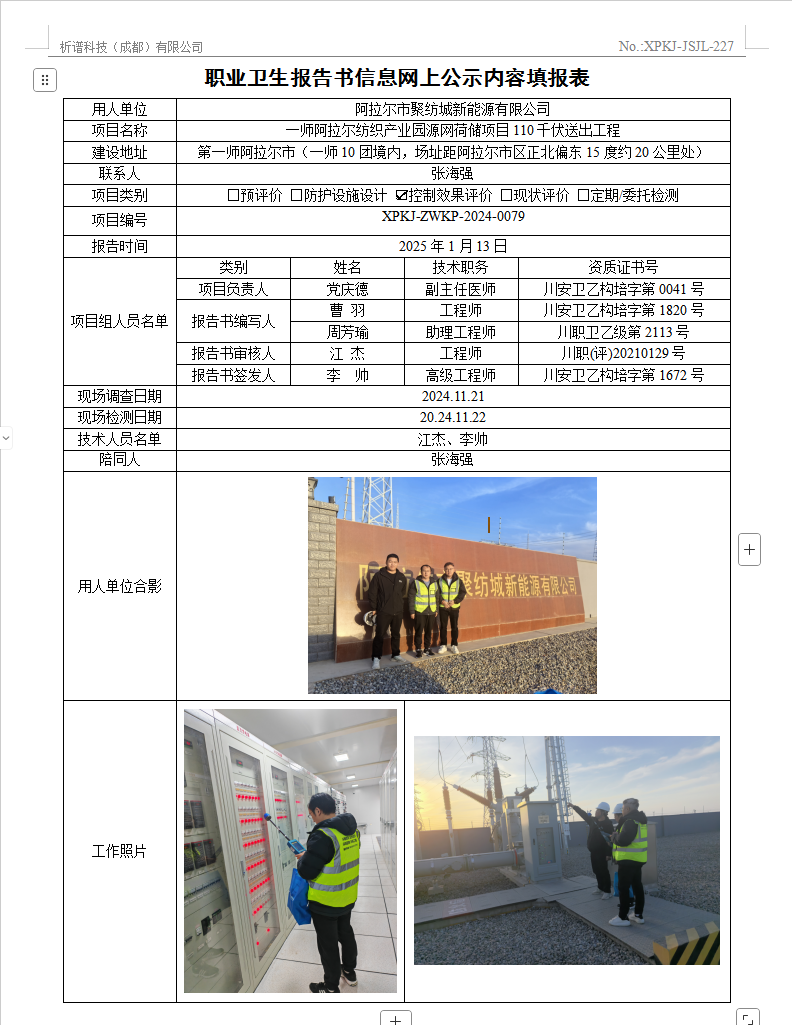 阿拉尔市聚纺城新能源有限公司一师阿拉尔纺织产业园源网荷储项目一期10万千瓦光伏发电项目职业病危害因素控制效果评价