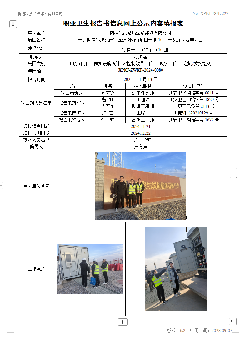 阿拉尔市聚纺城新能源有限公司一师阿拉尔纺织产业园源网荷储项目一期10万千瓦光伏发电项目职业病危害因素控制效果评价
