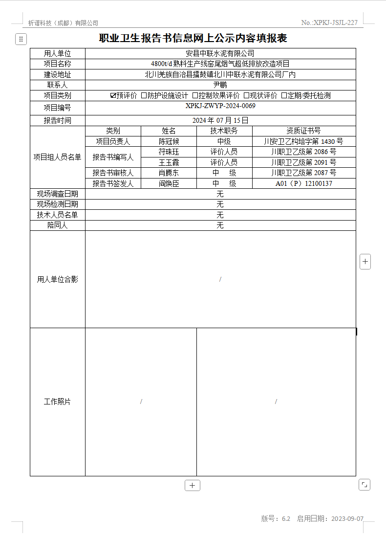 安县中联水泥有限公司4800t d熟料生产线窑尾烟气超低排放改造项目职业病危害因素预评价