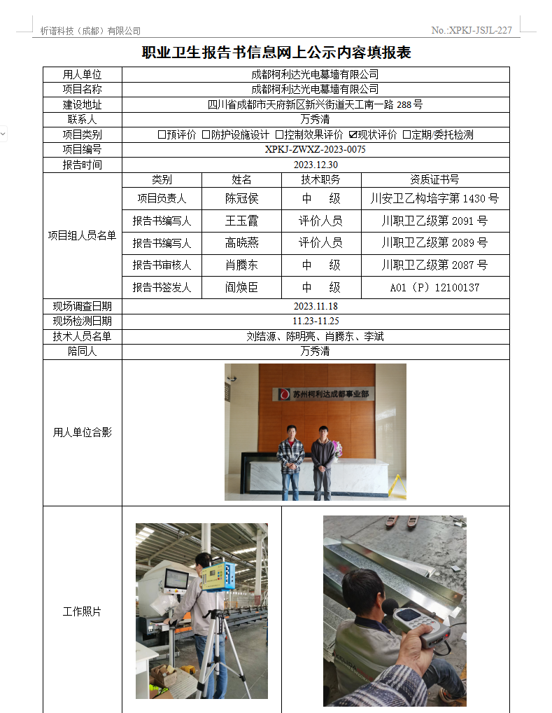 日东材料科技(成都)有限公司崇州市日东(OLED工程用)大尺寸光学保护膜技改项目职业病危害因素预评价