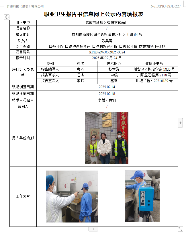 成都市新都区香柏树食品厂职业病危害因素定期检测