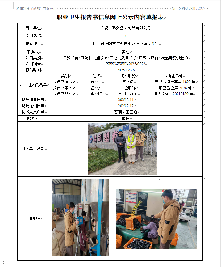 广汉市鸿剑塑料制品有限公司职业病危害因素定期检测