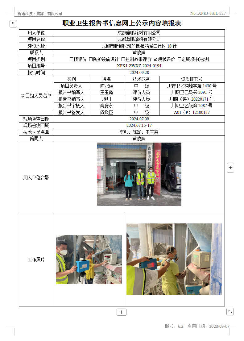 成都鑫鹏涂料有限公司职业病危害因素现状评价