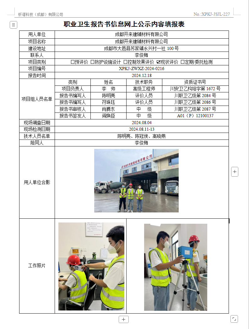 成都开来建辅材料有限公司职业病危害因素现状评价
