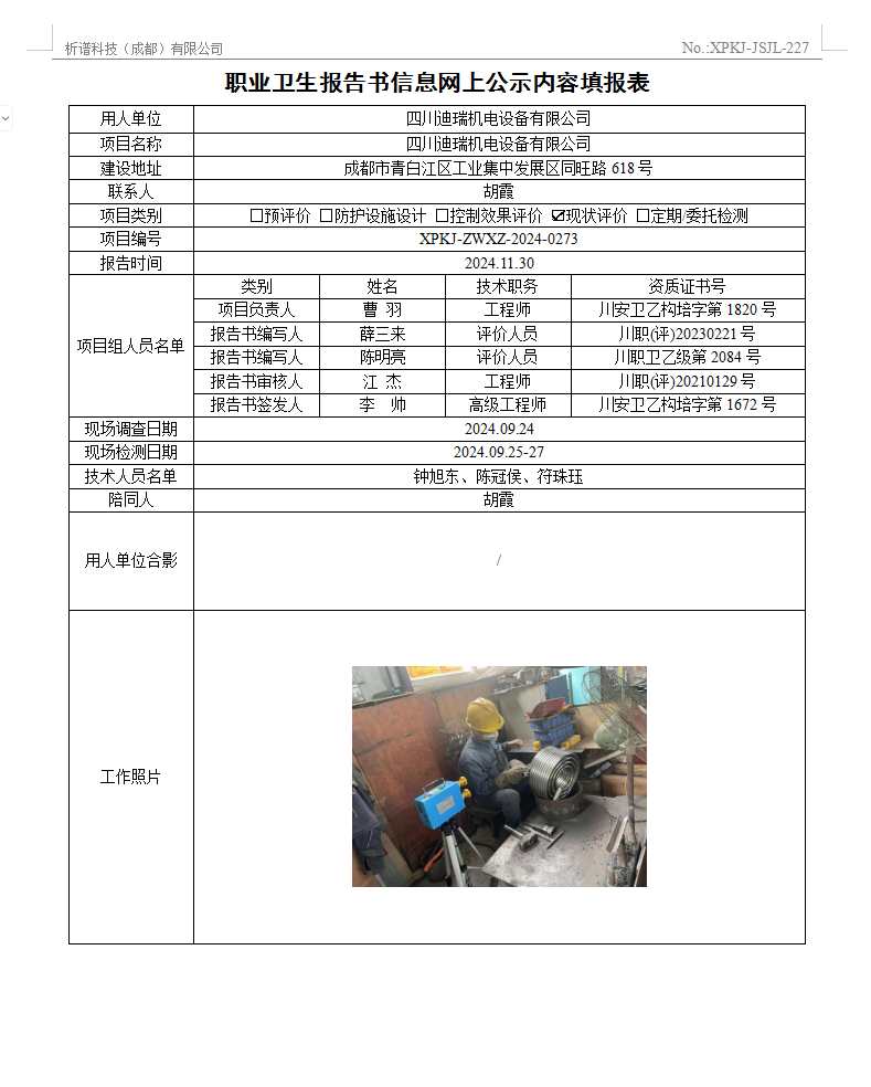 四川迪瑞机电设备有限公司职业病危害现状评价