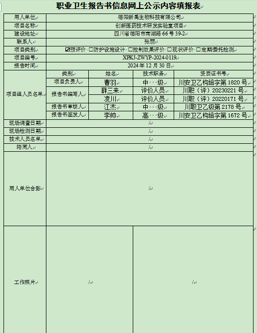 德阳新禹生物科技有限公司职业病危害因素预评价