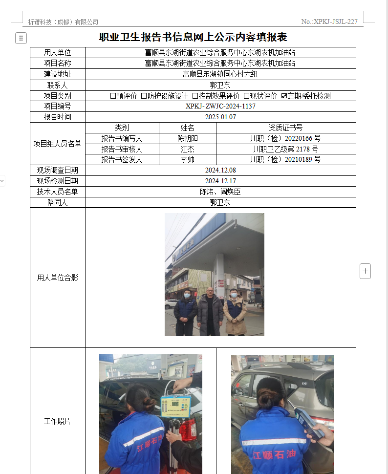 富顺县东湖街道农业综合服务中心东湖农机加油站职业病危害因素定期检测