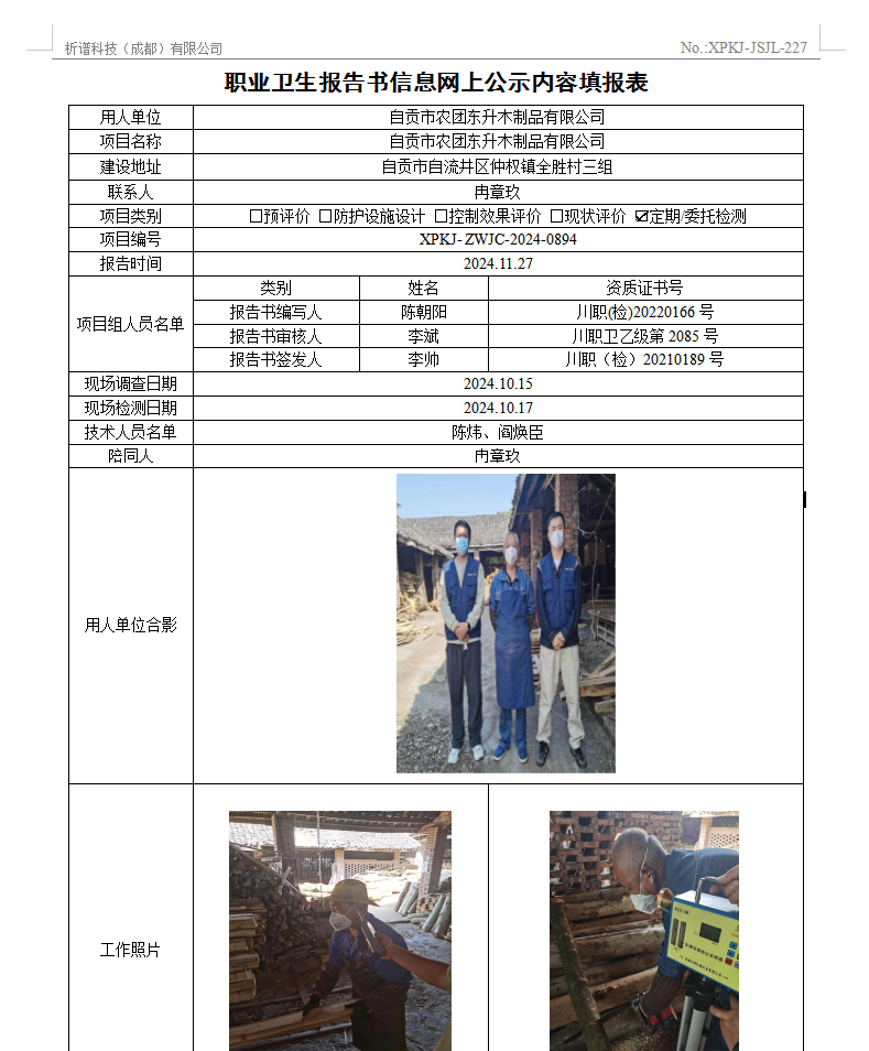 自贡市农团东升木制品有限公司职业病危害因素定期检测