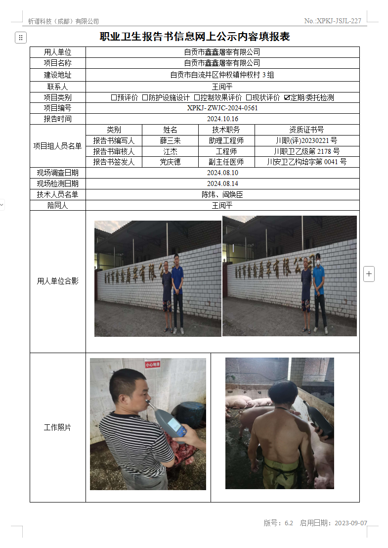 自贡信开水环境治理有限公司贡井污水处理厂(一期)职业病危害因素定期检测