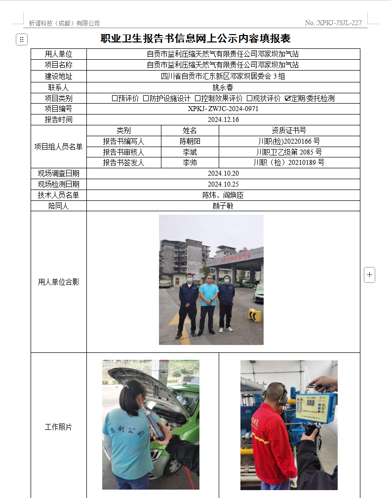 自贡市益利压缩天然气有限责任公司邓家坝加气站职业病危害因素定期检测