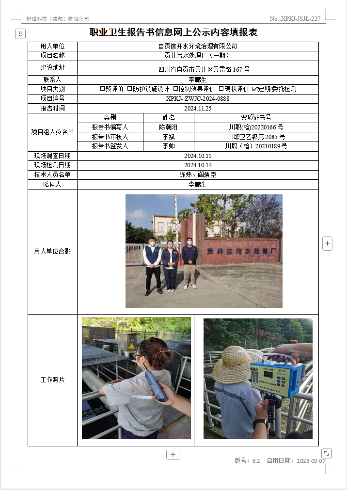 自贡信开水环境治理有限公司贡井污水处理厂(一期)职业病危害因素定期检测