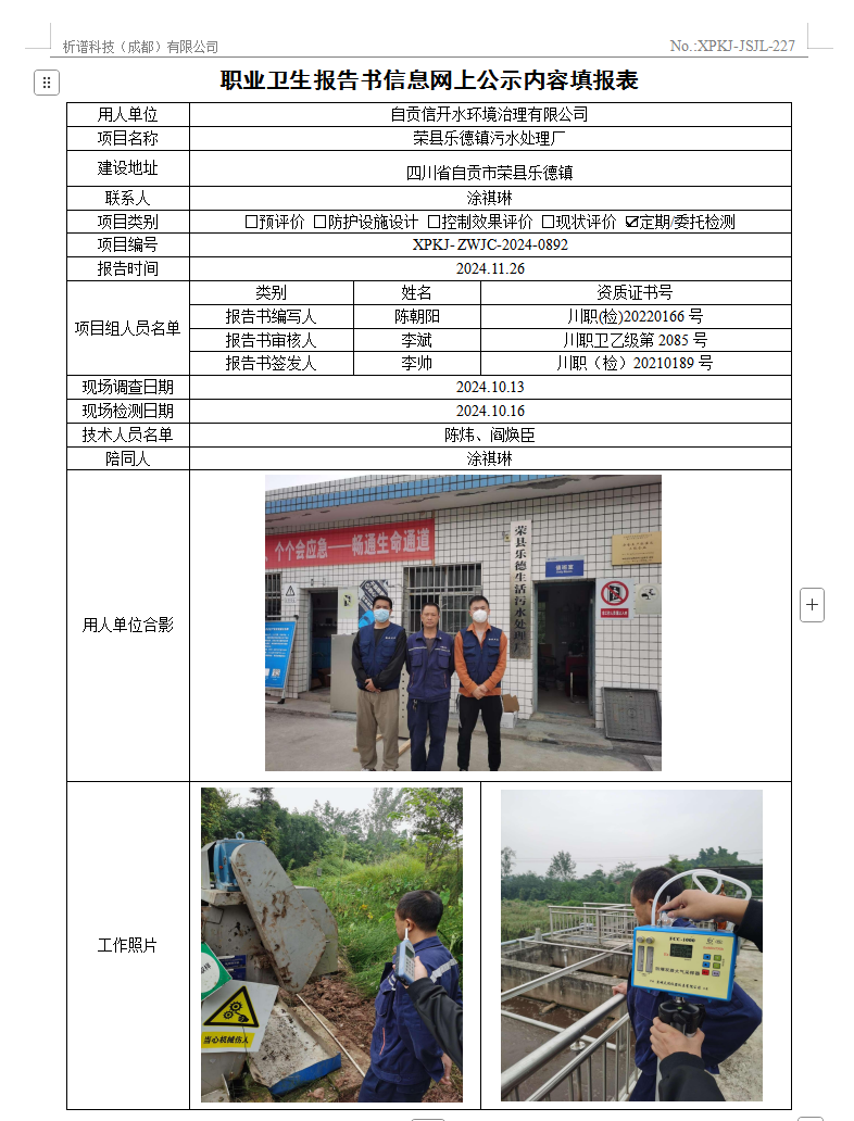 自贡信开水环境治理有限公司-荣县乐德镇污水处理厂职业病危害因素定期检测