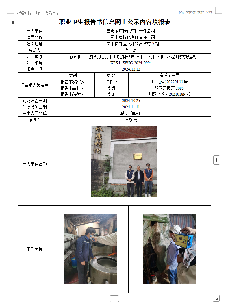自贡永康精化有限责任公司职业病危害因素定期检测