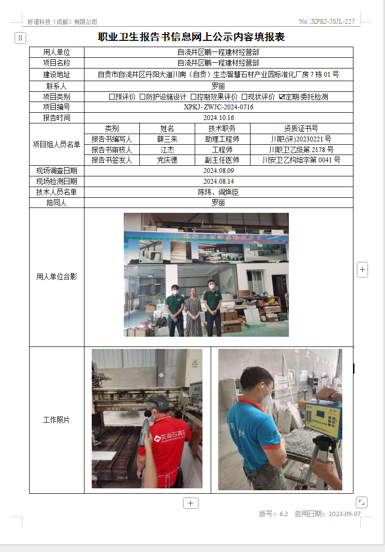自流井区鹏一程建材经营部职业病危害因素定期检测