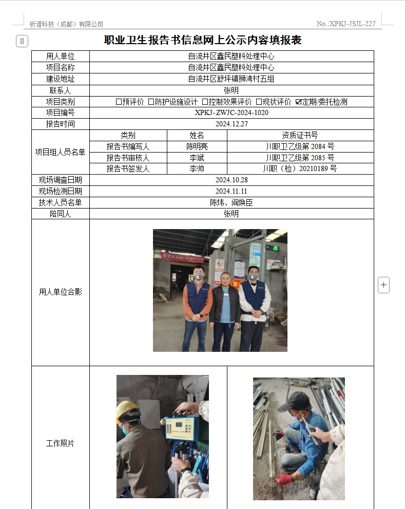 自流井区鑫民塑料处理中心职业病危害因素定期检测