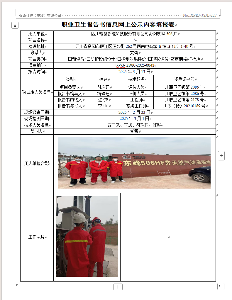 四川瑞锦新能科技服务有限公司资阳东峰506井职业病危害因素定期检测