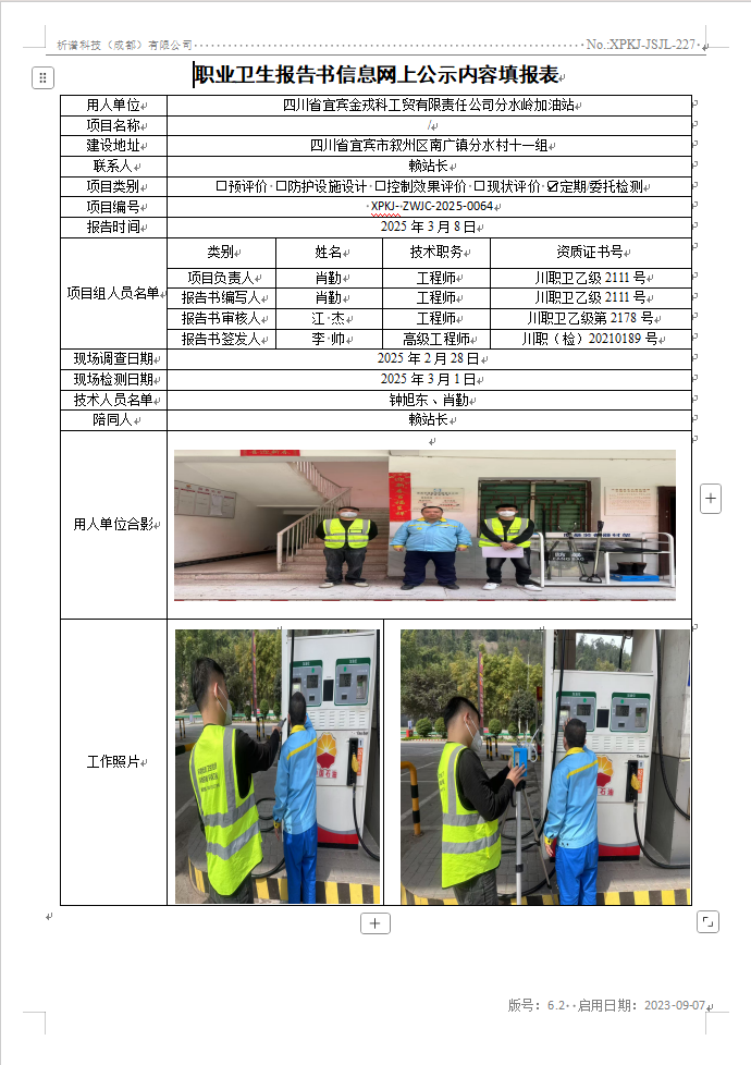 四川省宜宾金戎科工贸有限责任公司分水岭加油站职业病危害因素定期检测