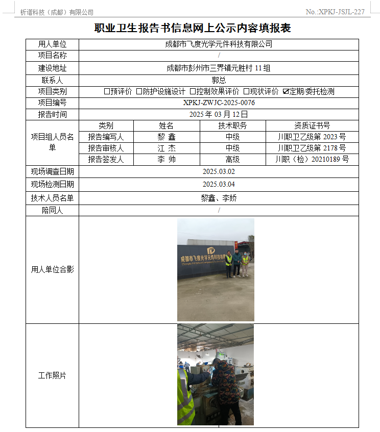 成都市飞度光学元件科技有限公司职业病危害因素定期检测
