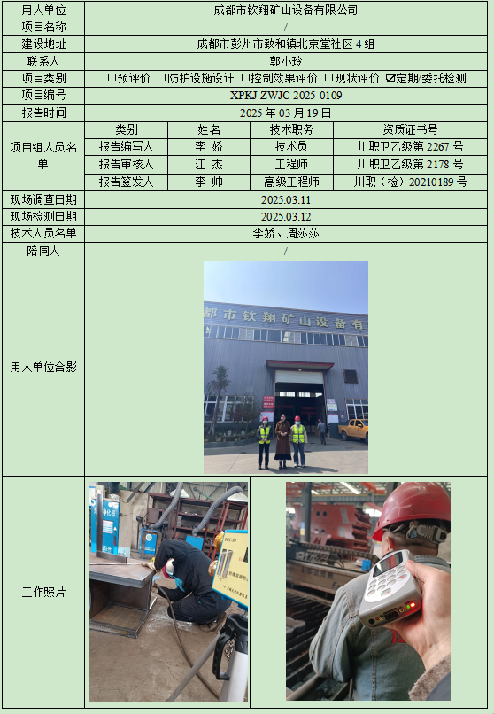 成都市钦翔矿山设备有限公司职业病危害因素定期检测