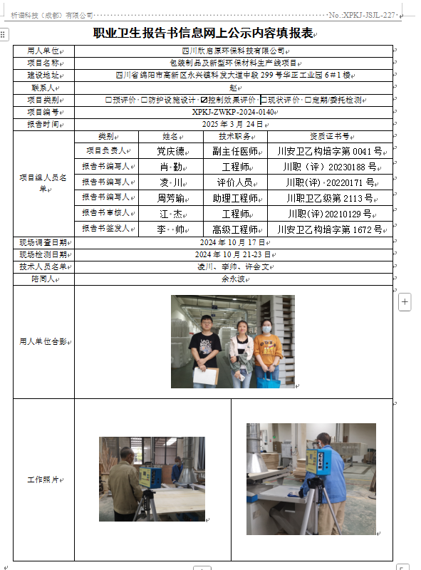 四川欣启原环保科技有限公司职业病危害因素控制效果评价