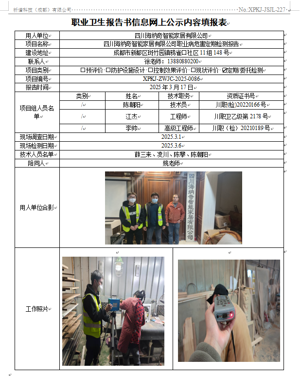 四川海纳奇智能家居有限公司职业病危害因素定期检测