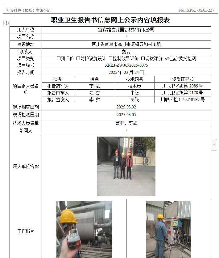 宜宾路友路面新材料有限公司职业病危害因素定期检测