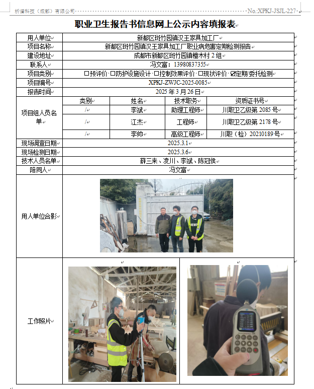新都区斑竹园镇汉王家具加工厂职业病危害因素定期检测