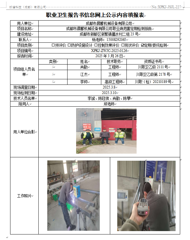 成都市晨馨机械设备有限公司职业病危害因素定期检测